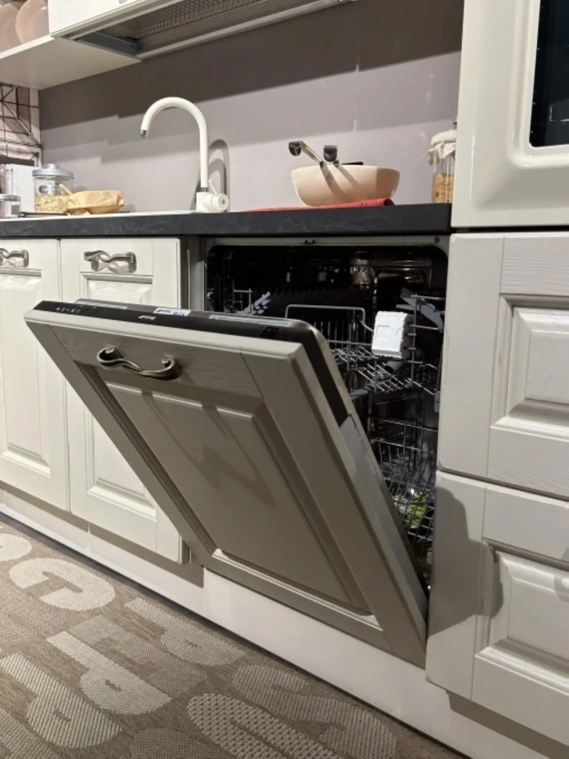 - Lavastoviglie Smeg: da incasso a scomparsa totale, 60 cm e con altezza commerciale di 82 cm, 12 coperti, classe di efficienza energetica A+ (secondo la vecchia normativa) con un consumo idrico di 12 litri per ciclo nel programma ECO, 5 programmi di lavaggio a quattro temperature diverse (45°C, 50°C, 65°C, 70°C), tra cui Ammollo, ECO, Normale e Super, e include la funzione 1/2 Carico, lavaggio è assicurato dal sistema Orbitale, asciugatura avviene per condensazione naturale, cestelli sono in colore grigio, con il cestello superiore regolabile in altezza su due livelli, ed è inclusa la dotazione di un cestello portaposate, comandi sono elettronici con indicatori ottici per sale e brillantante e segnale sonoro di fine ciclo, sistema anti-allagamento Acquastop singolo