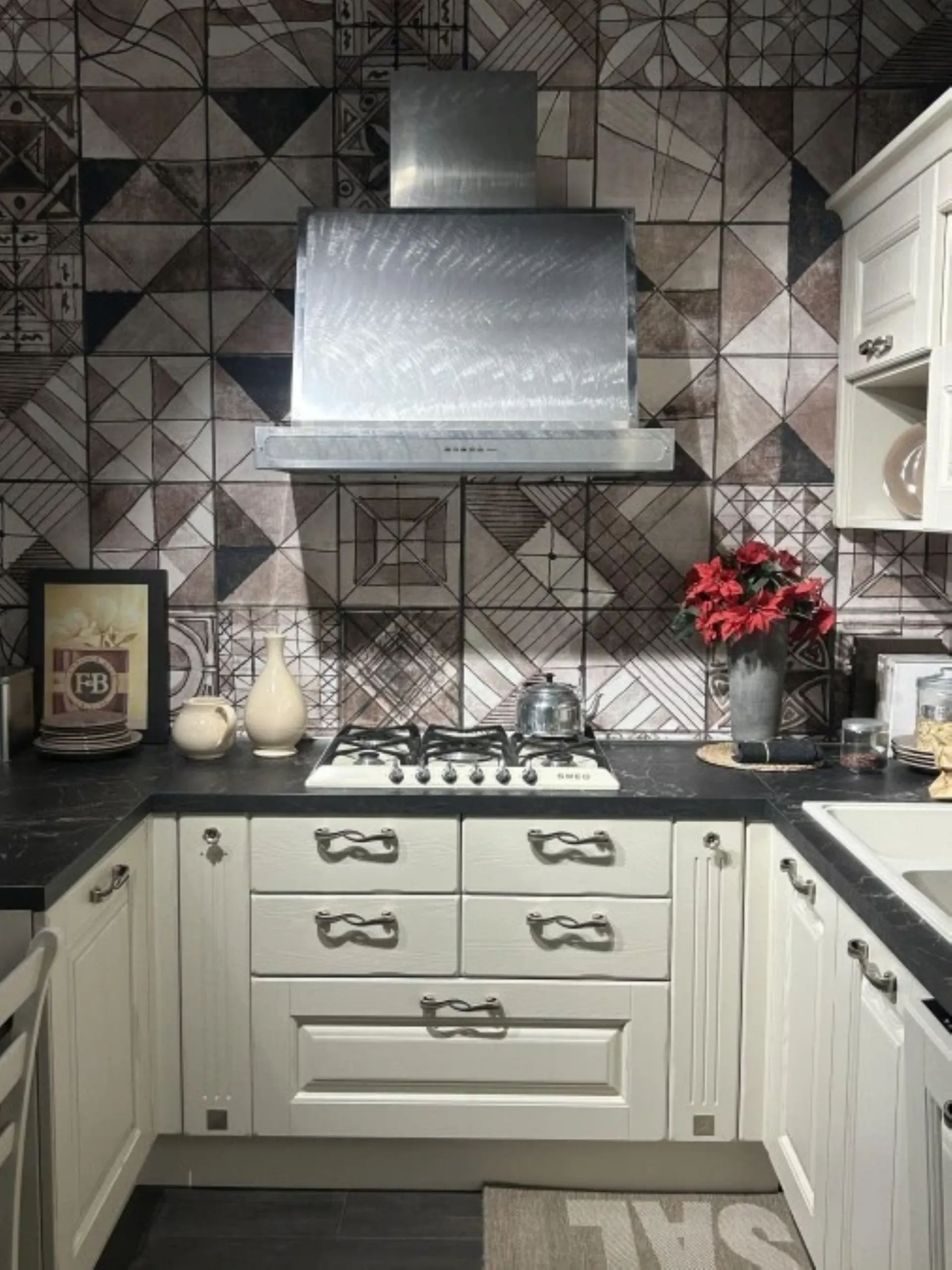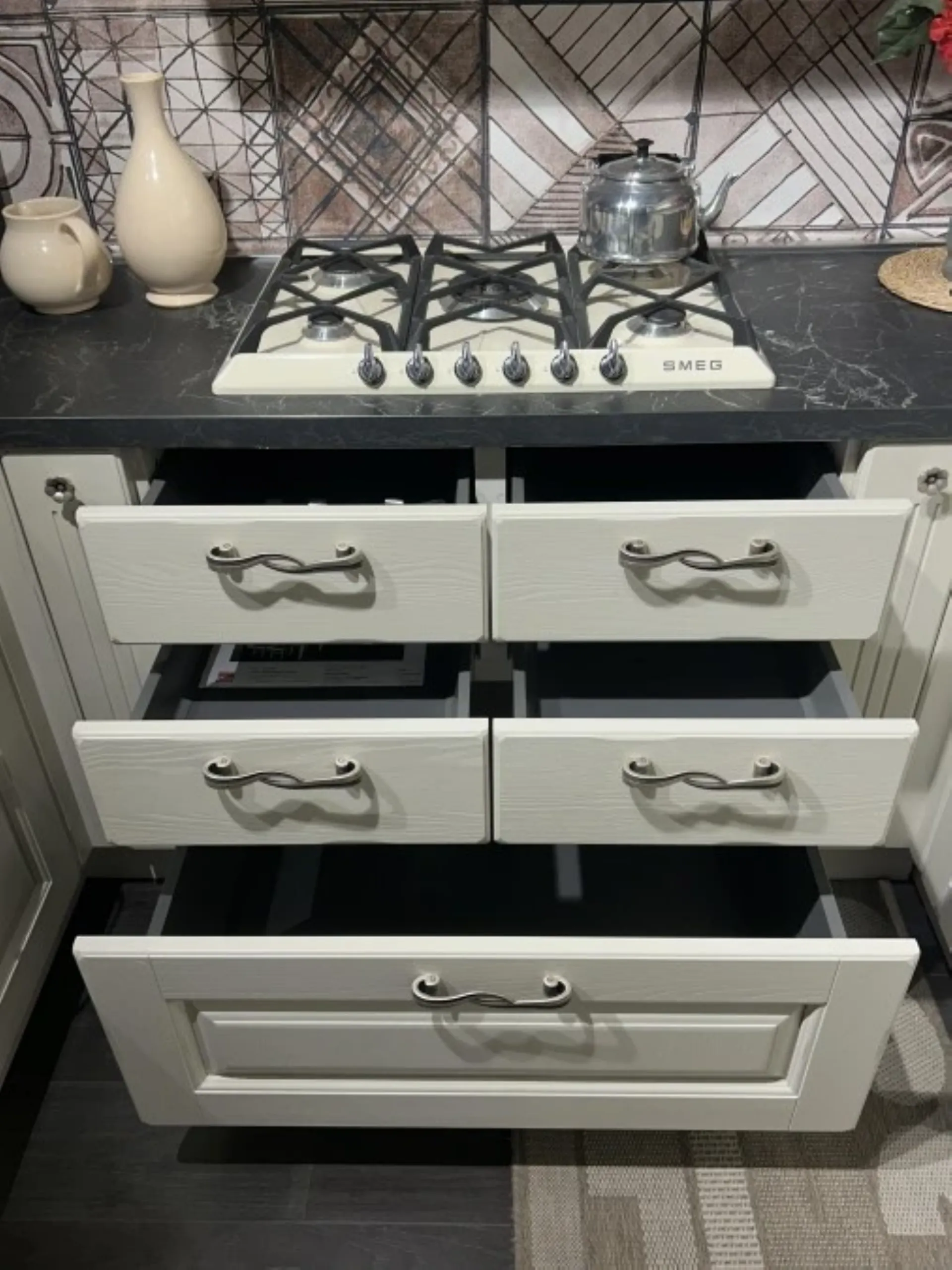 - Piano cottura Smeg: modello a gas da 70 cm che appartiene all'estetica Victoria, finitura in colore Panna e installazione a incasso tradizionale. Dispone di 5 fuochi, tra cui un potente bruciatore Ultrarapido (Dual) da 5,00 kW posizionato centralmente, supportato da griglie robuste in ghisa. I comandi sono gestiti tramite 6 manopole frontali cromo e integra la valvolatura di sicurezza e l'accensione elettronica rapida sotto manopola